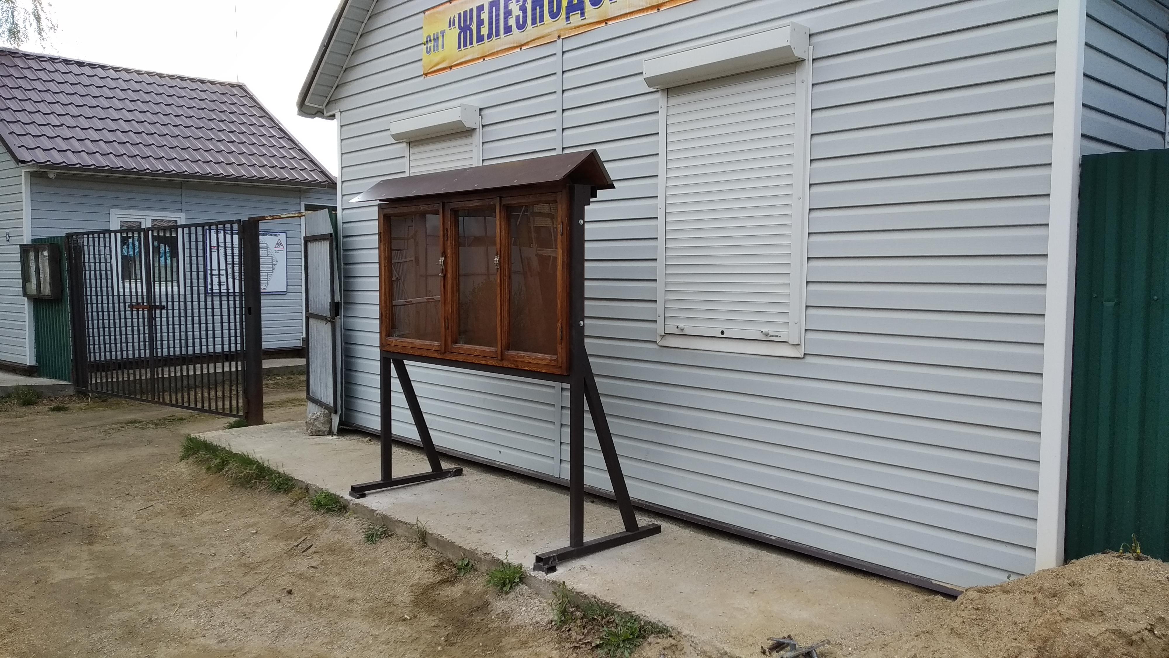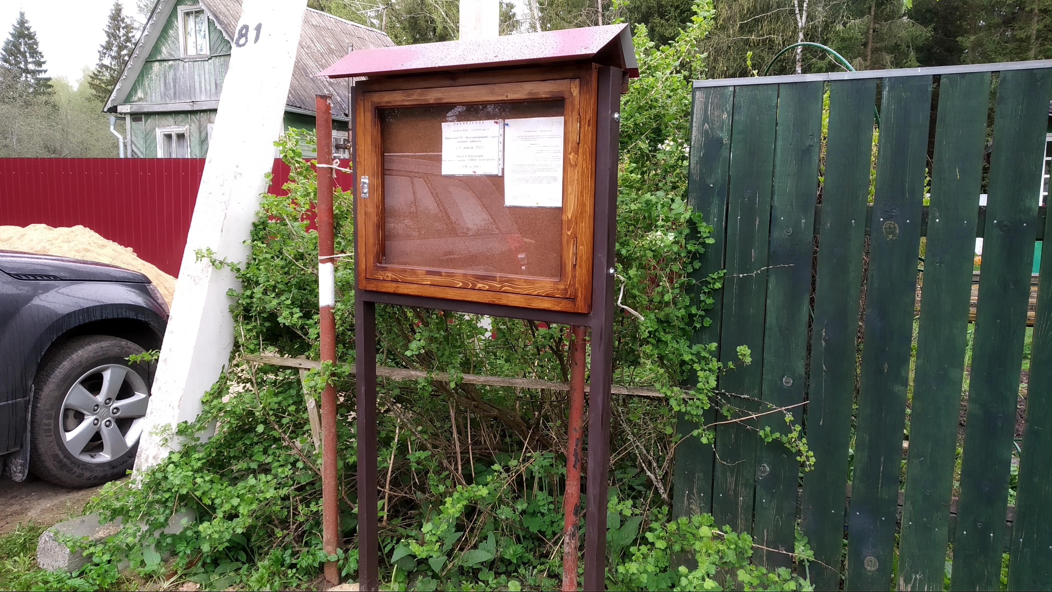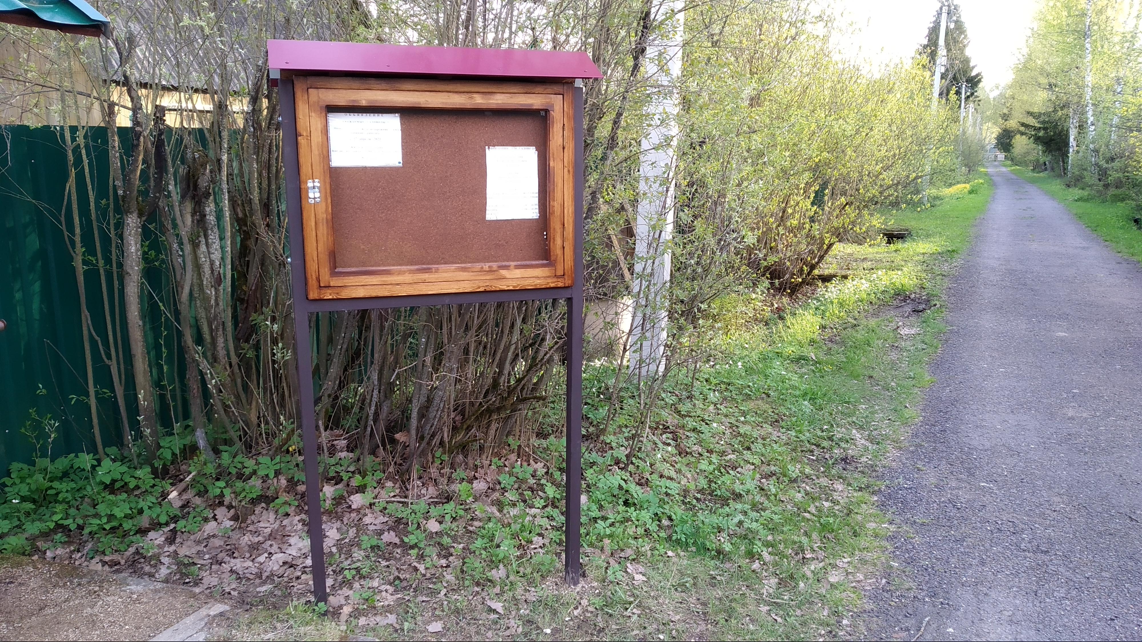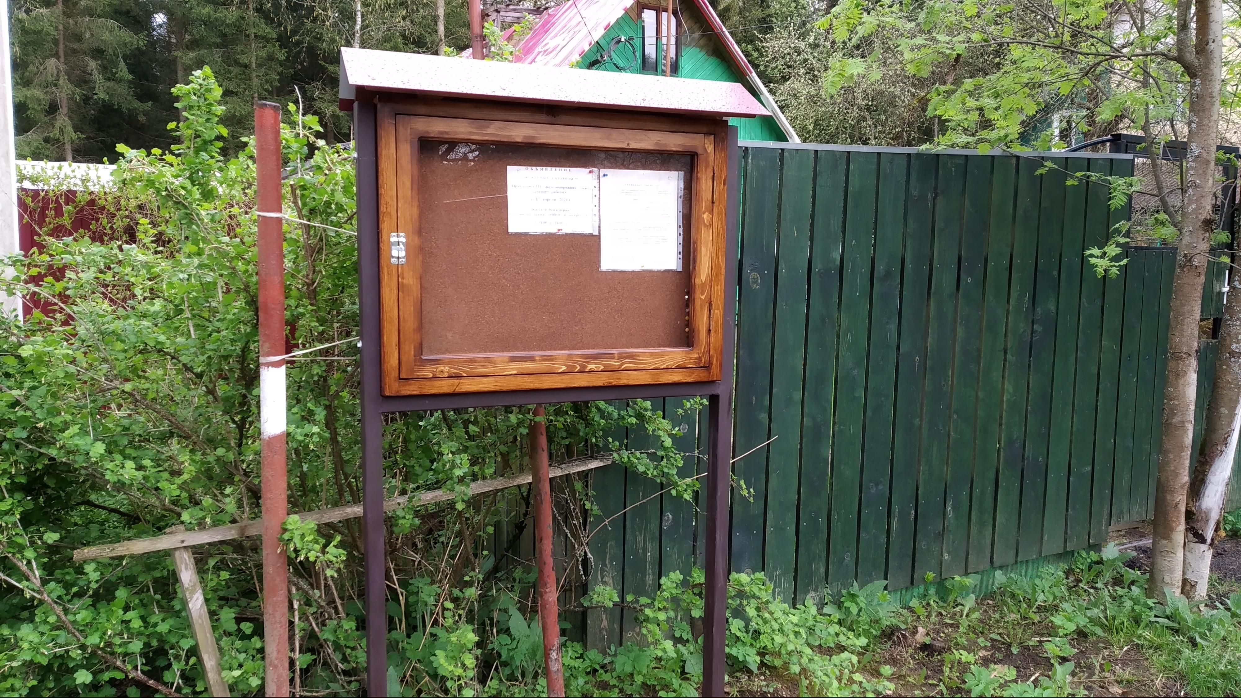 07.05.21 Установлена новая доска объявлений у здания правления. Доска имеет два отделения. Одно для официальных сообщений правления. Другое для объявлений садоводов. (Типа куплю-продам участок за миллион долларов, потерялся кот, нашёлся пёс. )))